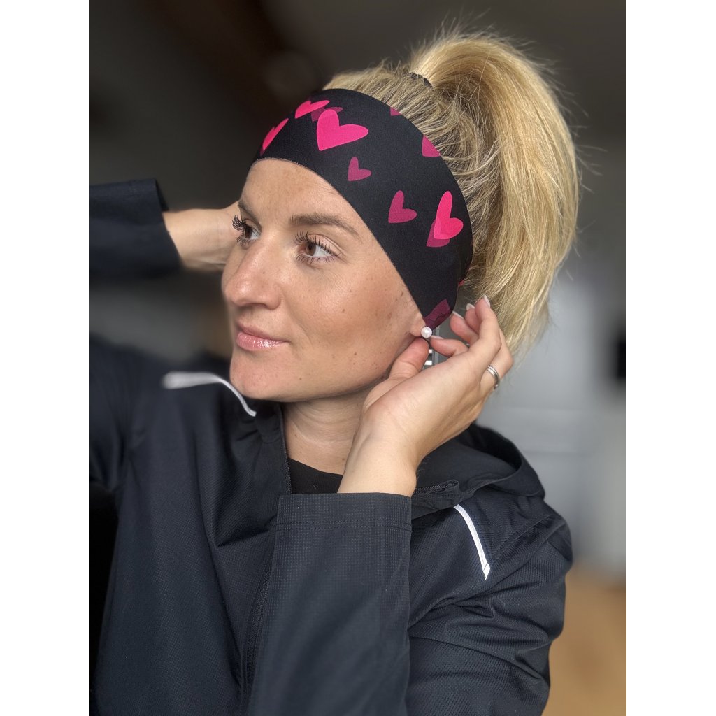 Ultralehká sportovní čelenka, kterou na hlavě skoro necítíš. Černý design s růžovými srdíčky sluší každé dívce či ženě.