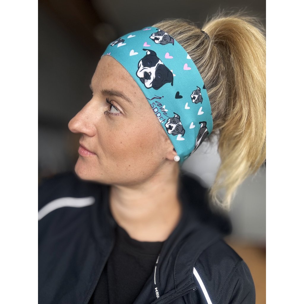 Zamiluj se do pohybu i do psích oušek. Čelenka Staffordi spojuje praktičnost se stylem - roztomilý motiv staffordů, srdíček a svěží tyrkysovou barvou přináší radost do každého tréninku.